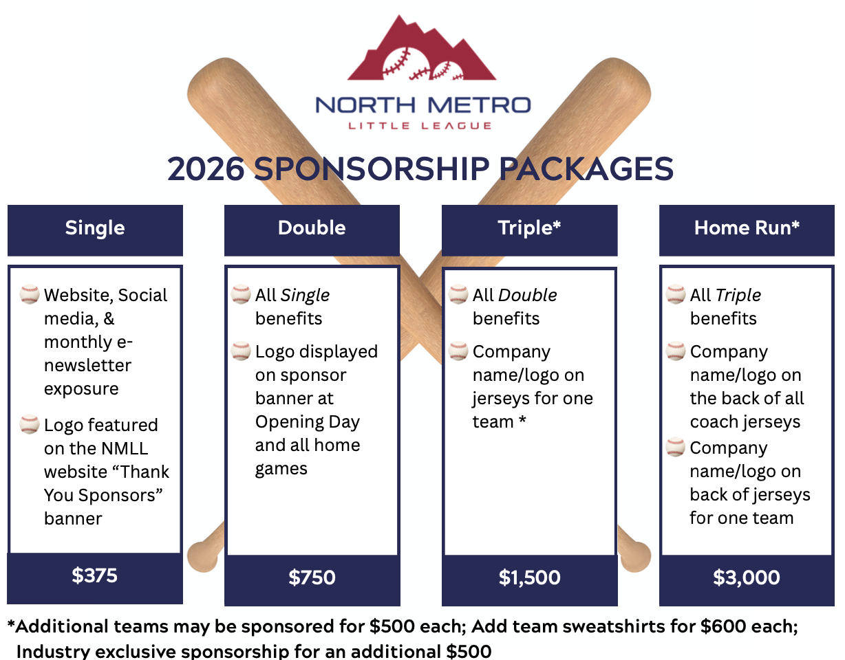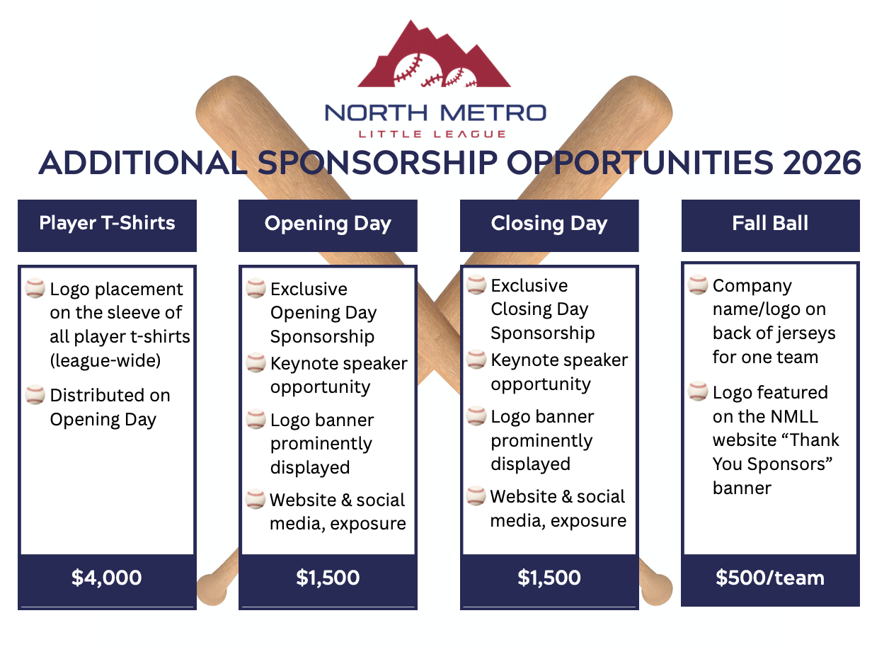 For more information on our sponsorship packages, in-kind sponosrships, or how we can align our League's goals with your company's desire to support youth sports in the local community, please reach out to Lynette Kaylor @ [email protected]